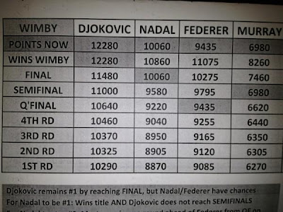 Federer depende de si mismo para hacer esto posible, ya que si gana el título sin importar lo que haga el resto, el suizo volverá a lo más alto de la clasificación mundial, Superando el Record de Pete Sampras con el mayor número de semanas como #1, además de conseguir su 7mo título en la Catedral del Tenis.